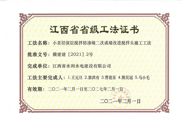 2021年2月1日,江西省住房和城乡建设厅文件《关于公布我省2020年度第二批省级工程建设工法的通知》(赣建建〔2021〕2号)公布了2021年度第二批省级工程建设工法评审结果,其中,公司申报的《小直径深层搅拌防渗墙二次成墙改进搅拌头施工工法》、《嵌岩混凝土防渗墙液压抓斗纯抓发造槽施工工法》审定为“2020年度省级工程建设工法”。