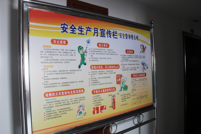 公司总部在办公楼悬挂“关注安全,平安是福”、“强化安全基础,推动安全发展”横幅,并在办公楼内每层摆放2个安全宣传牌。